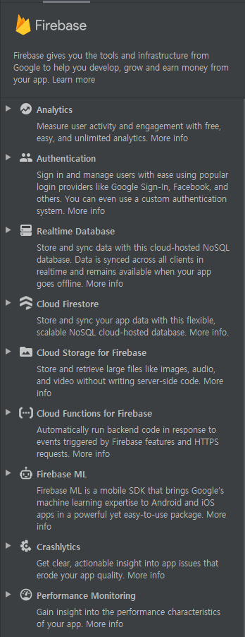 많은 목록 중에서 RealTime Database를 클릭합니다.