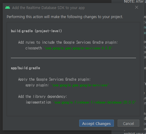 그러면 아래 사진과 같이 build파일에 추가해줘야할 라이브러리를 알려줍니다. Accept Changes를 눌러 변경해줍니다.